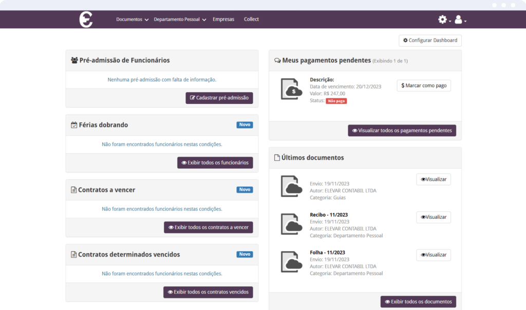 Visualize na sua tela inicial os Contratos a vencer, Guias pendentes, admissões de empregados, documentos enviados e muito mais